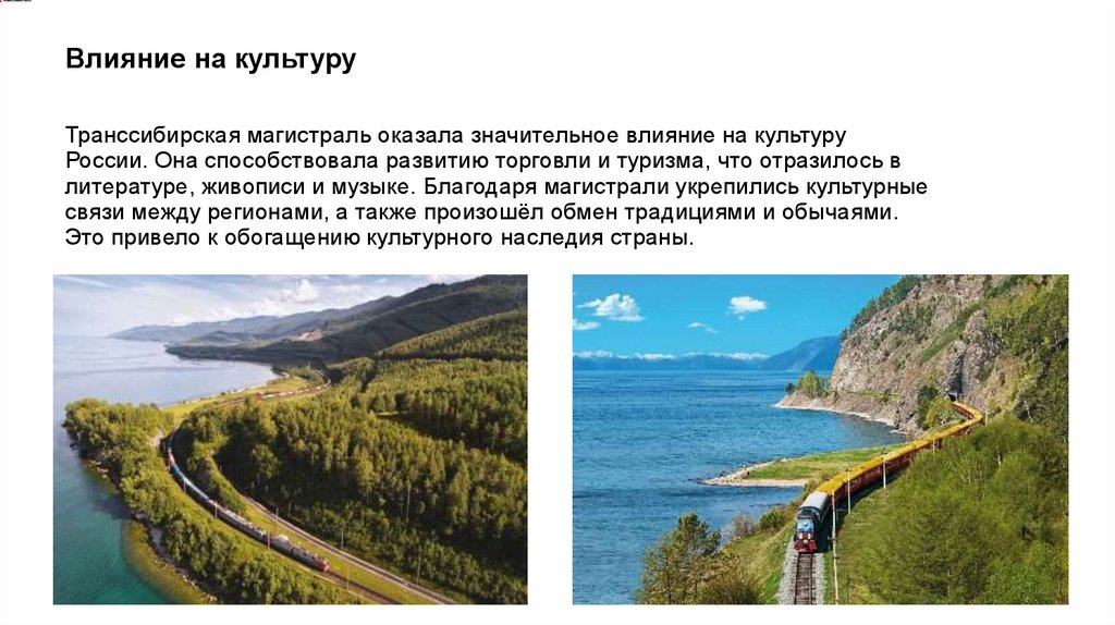 Влияние на культуруТранссибирская магистраль оказала значительное влияние на культуру