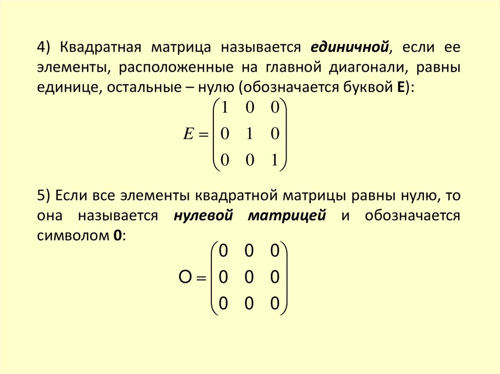 4) Квадратная матрица называется единичной, если ееэлементы, расположенные на главной диагонали, равны