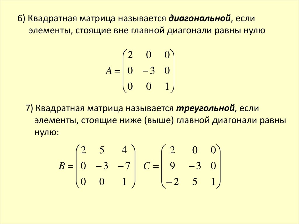 6) Квадратная матрица называется диагональной, еслиэлементы, стоящие вне главной диагонали равны нулю