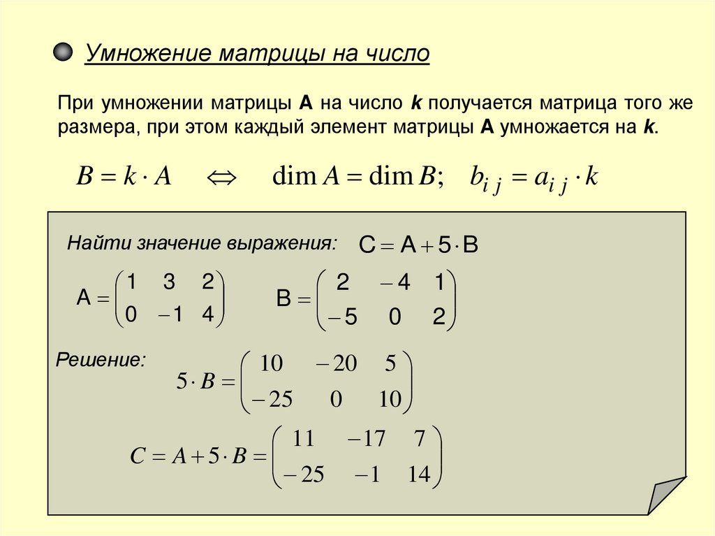 Умножение матрицы на числоПри умножении матрицы A на число k получается матрица того же