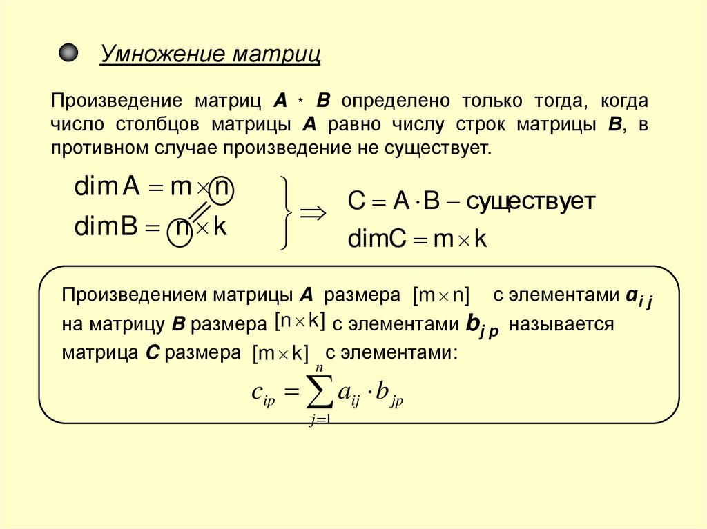 Умножение матрицПроизведение матриц A * B определено только тогда, когда