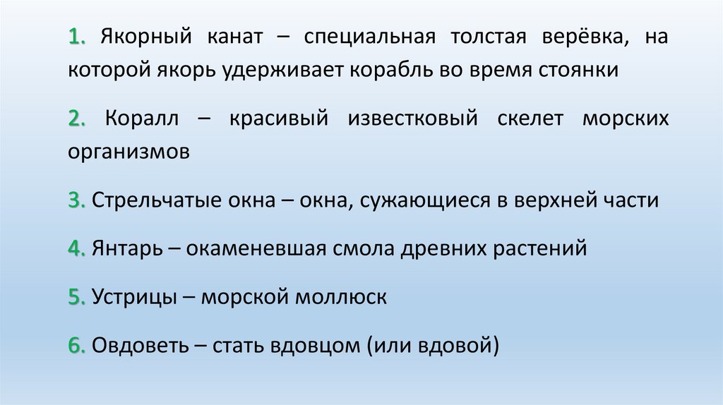 1. Якорный канат – специальная толстая верёвка, накоторой якорь удерживает корабль во время стоянки