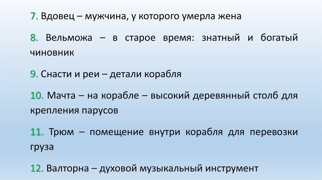 7. Вдовец – мужчина, у которого умерла жена8. Вельможа – в старое время: знатный и богатый