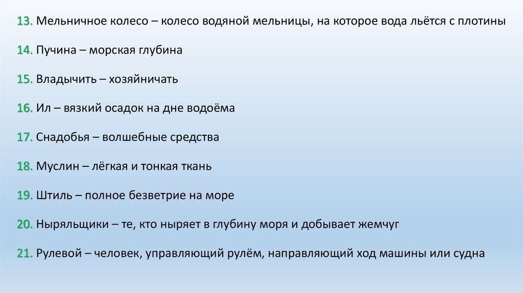 13. Мельничное колесо – колесо водяной мельницы, на которое вода льётся с плотины14. Пучина – морская глубина