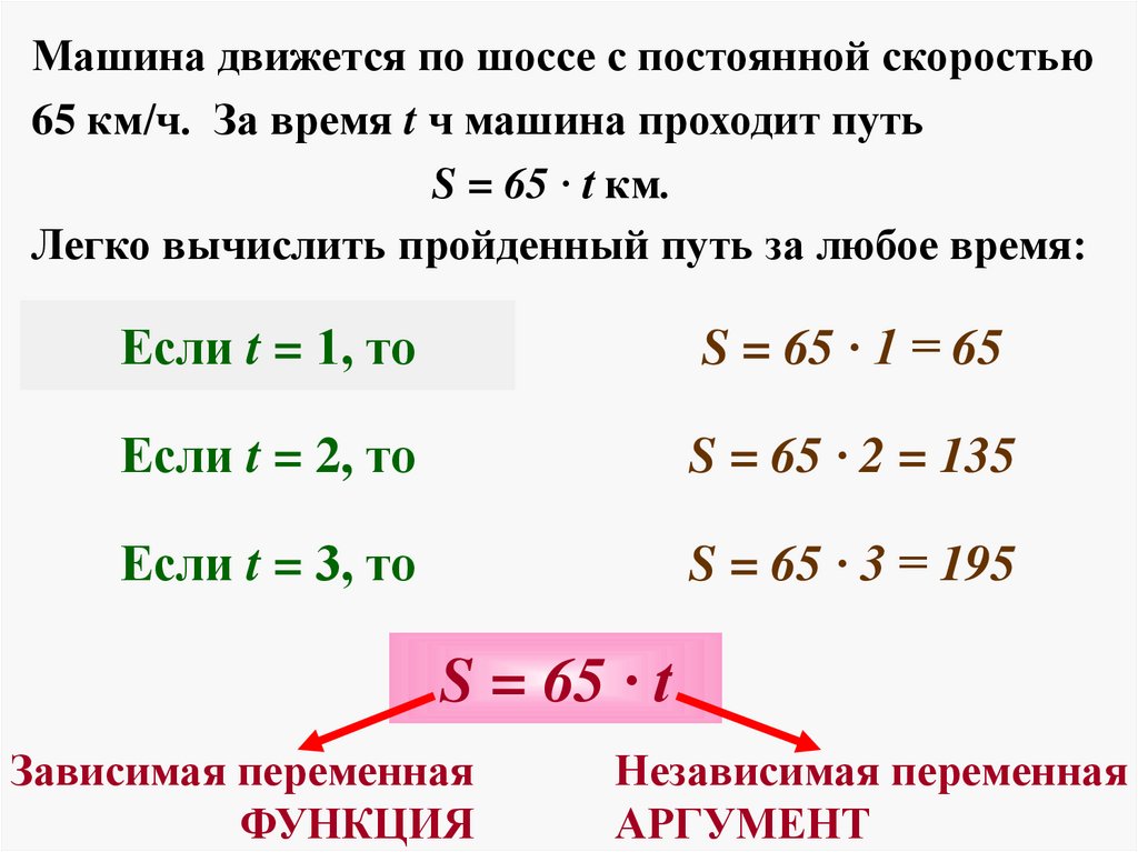 Машина движется по шоссе с постоянной скоростью65 км/ч. За время t ч машина проходит путь