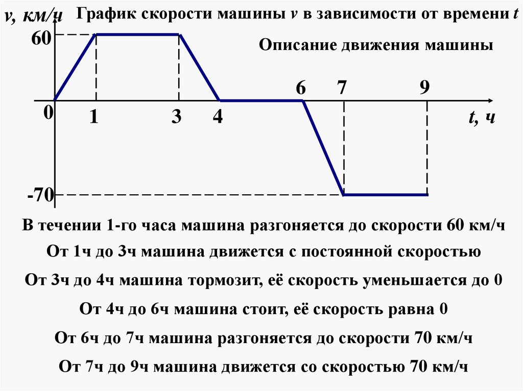 От 6ч до 7ч машина разгоняется до скорости 70 км/ч