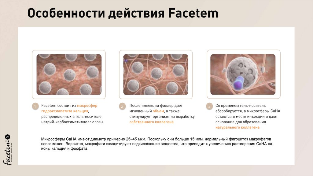 Микросферы CaHA имеют диаметр примерно 25–45 мкм. Поскольку они больше 15 мкм, нормальный фагоцитоз макрофагов