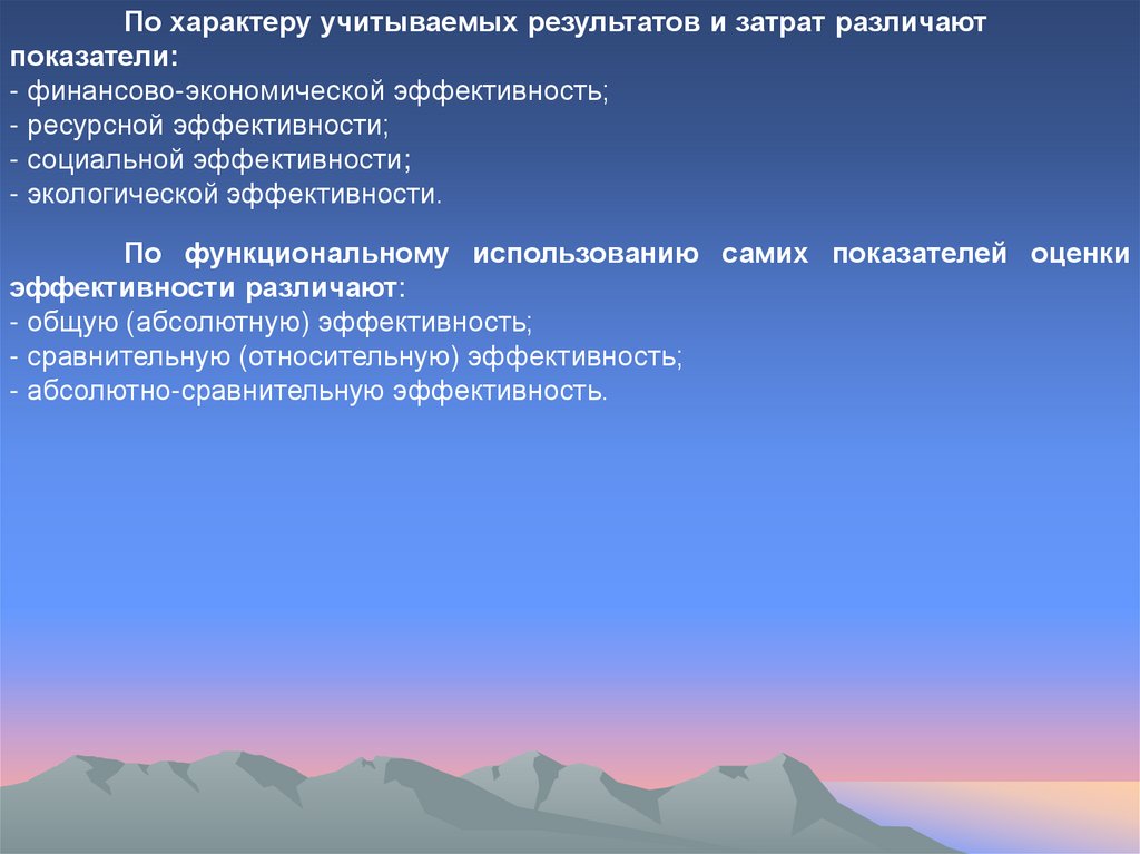 По характеру учитываемых результатов и затрат различаютпоказатели: