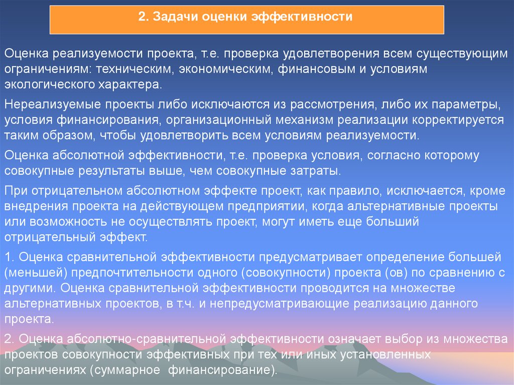 2. Задачи оценки эффективностиОценка реализуемости проекта, т.е. проверка удовлетворения всем существующим