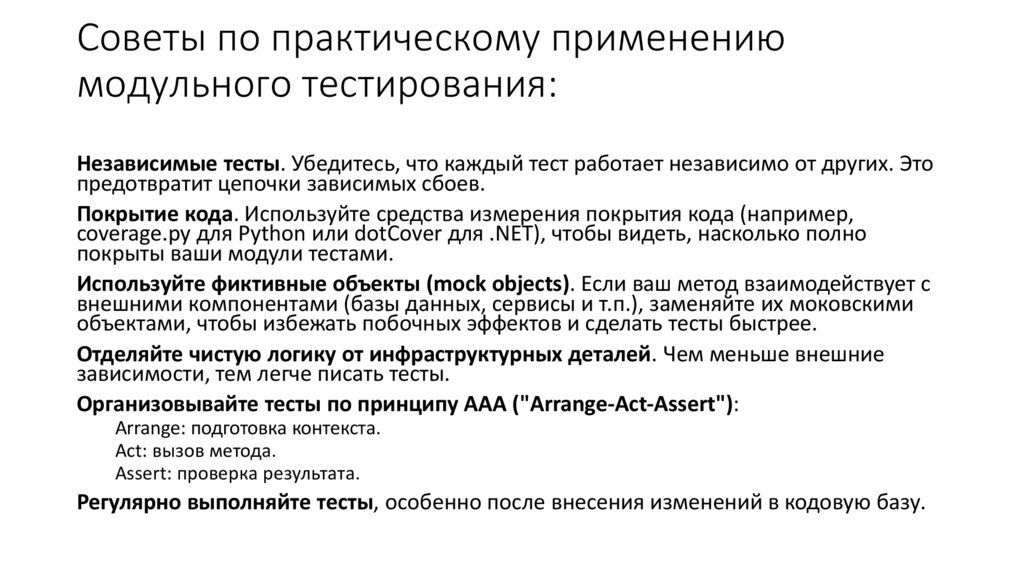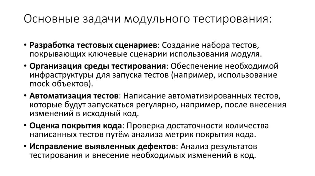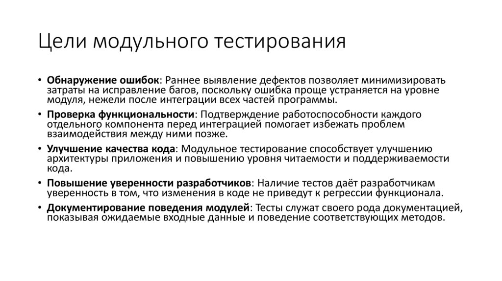 • Улучшение качества кода: Модульное тестирование способствует улучшению