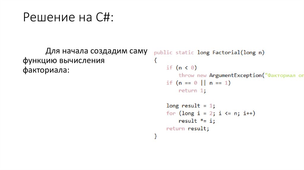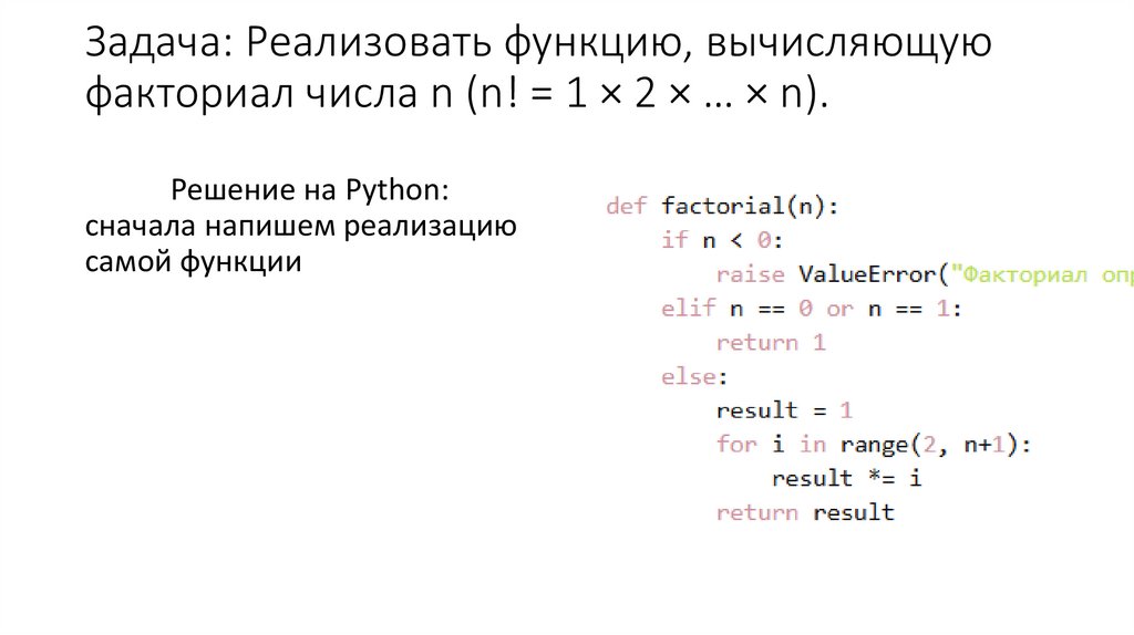 12. Задача: Реализовать функцию, вычисляющую факториал числа n (n! = 1 × 2 × … × n).