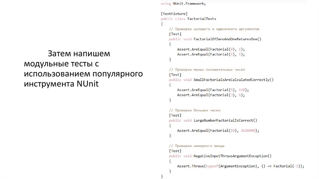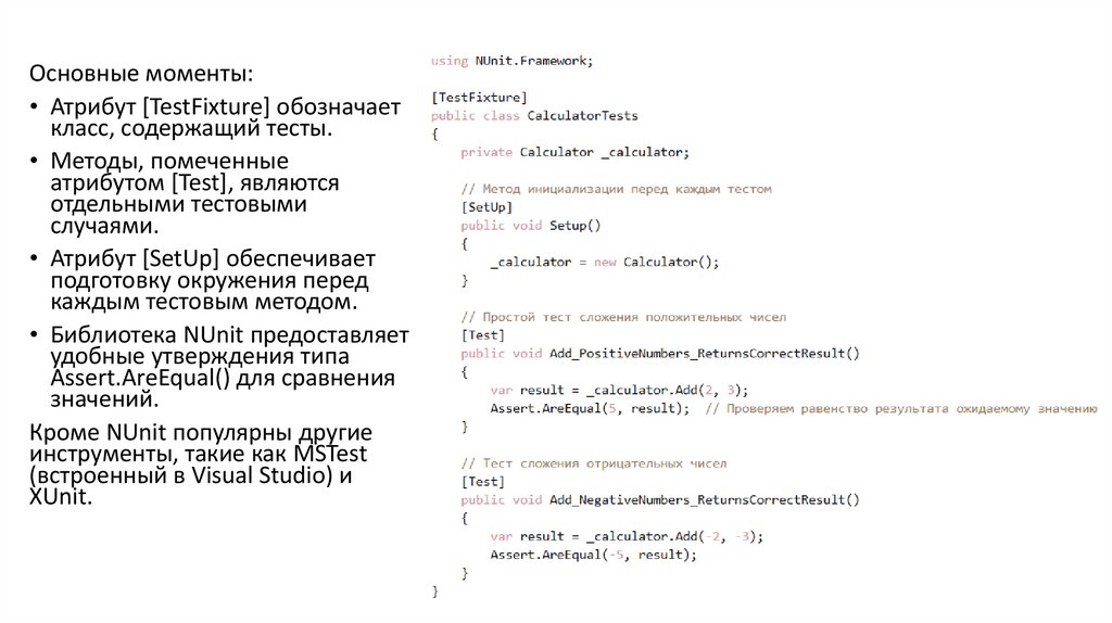 Основные моменты:• Атрибут [TestFixture] обозначает