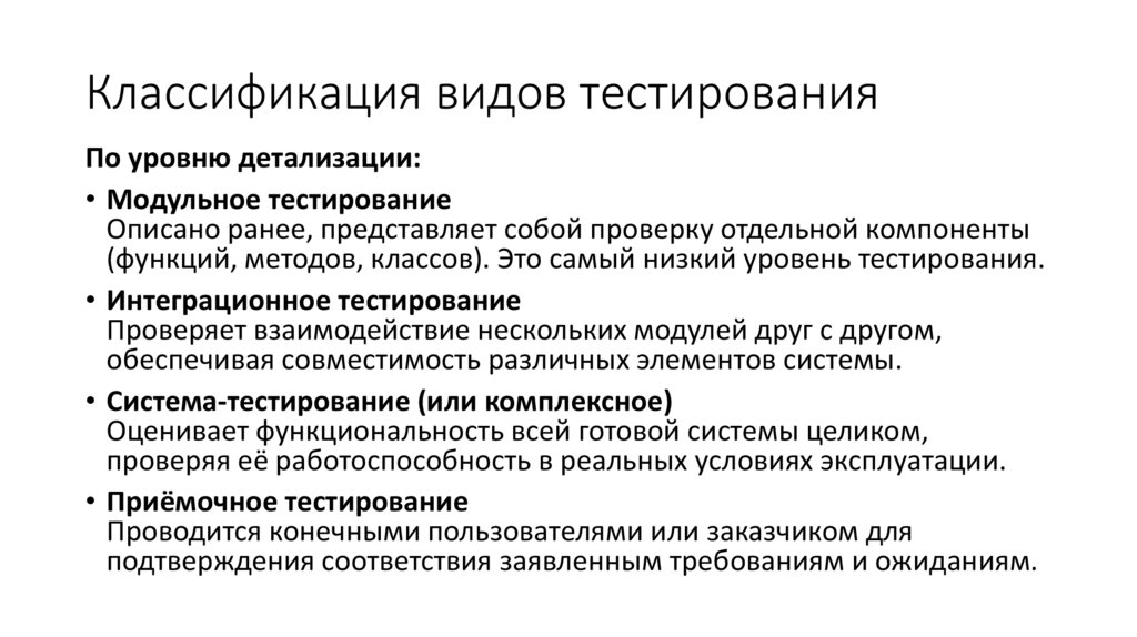 (функций, методов, классов). Это самый низкий уровень тестирования.