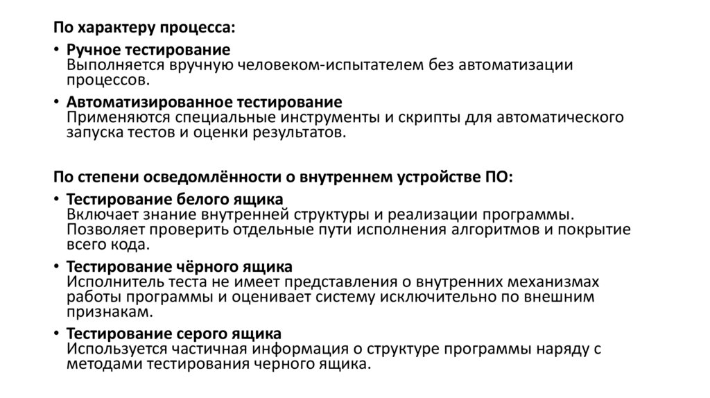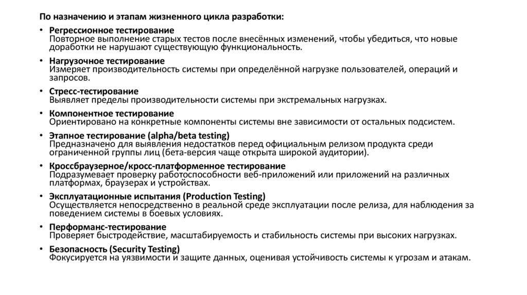 По назначению и этапам жизненного цикла разработки:• Регрессионное тестирование