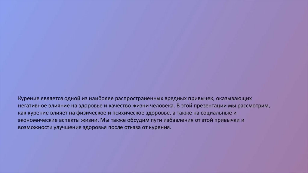 Курение является одной из наиболее распространенных вредных привычек, оказывающихнегативное влияние на здоровье и качество жизни человека. В этой презентации мы рассмотрим,