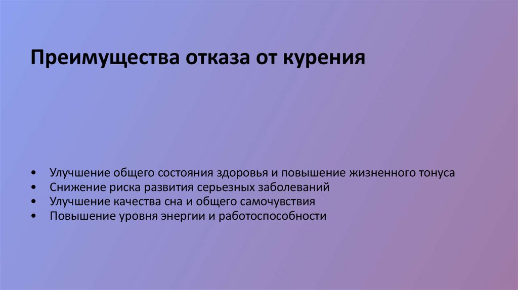Преимущества отказа от куренияУлучшение общего состояния здоровья и повышение жизненного тонуса