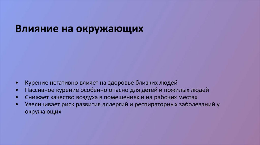 Влияние на окружающихКурение негативно влияет на здоровье близких людей