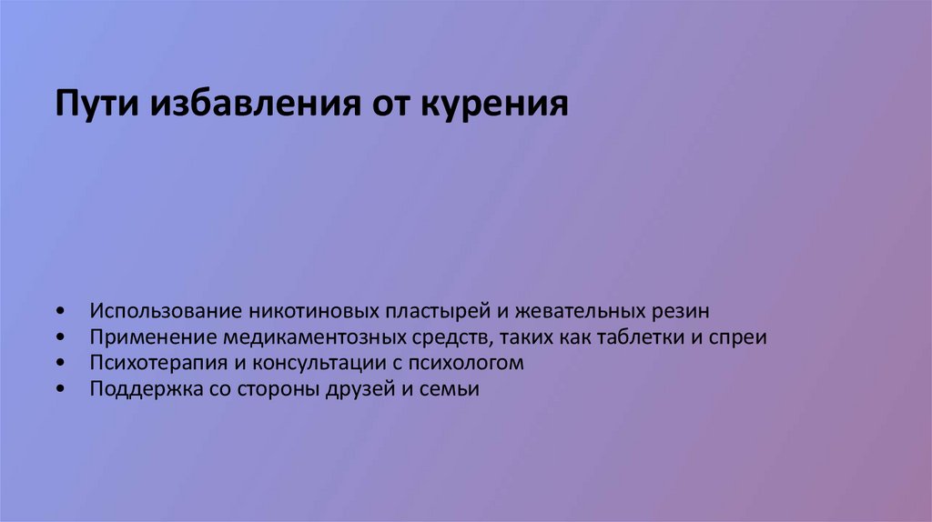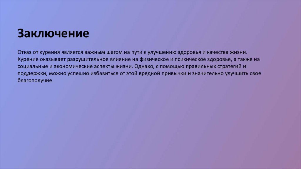 ЗаключениеОтказ от курения является важным шагом на пути к улучшению здоровья и качества жизни.