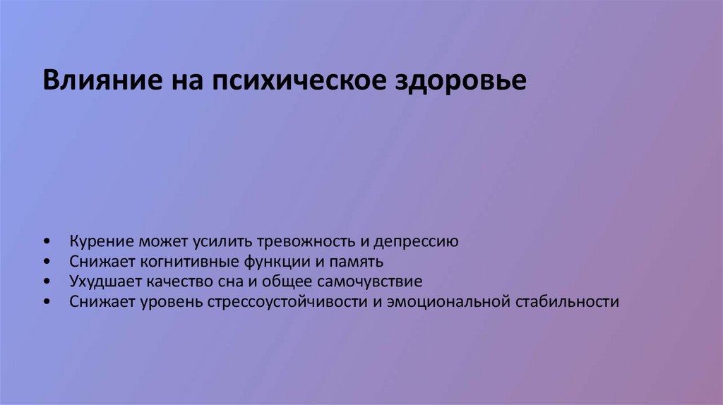Влияние на психическое здоровьеКурение может усилить тревожность и депрессию