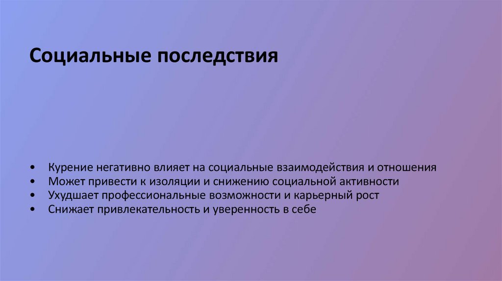 Социальные последствияКурение негативно влияет на социальные взаимодействия и отношения