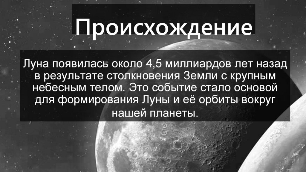 ПроисхождениеЛуна появилась около 4,5 миллиардов лет назад