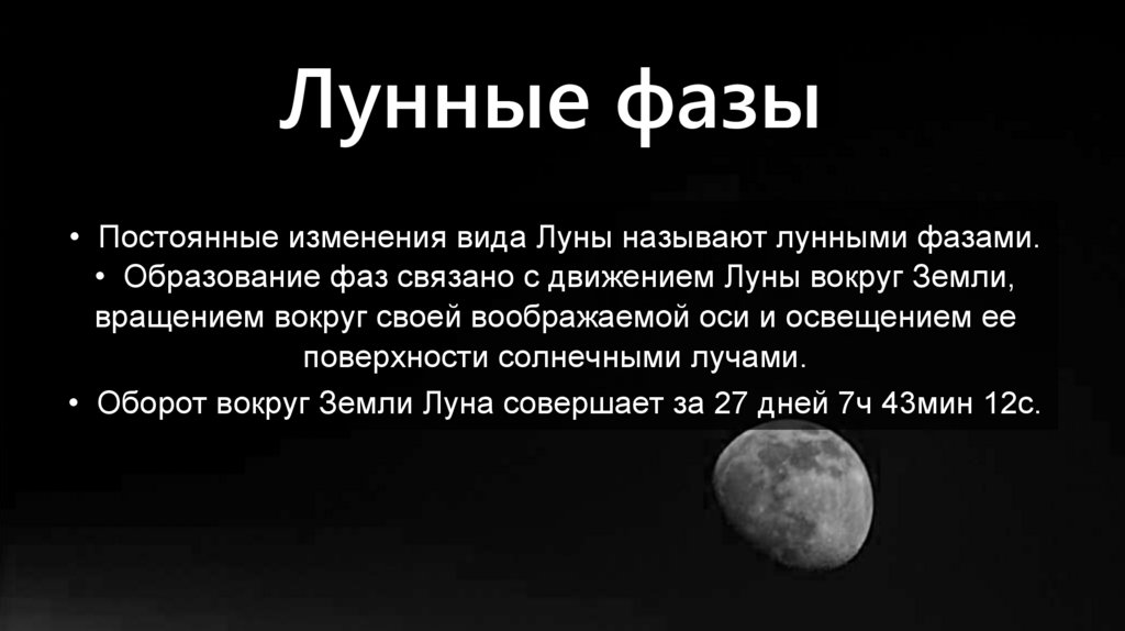 • Оборот вокруг Земли Луна совершает за 27 дней 7ч 43мин 12с.
