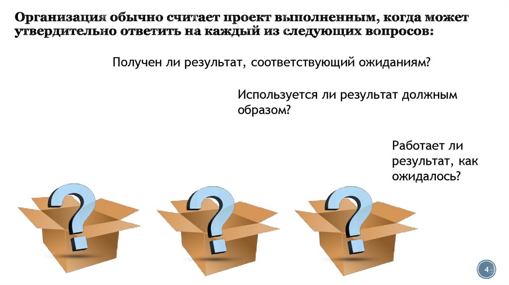 4. Организация обычно считает проект выполненным, когда может утвердительно ответить на каждый из следующих вопросов: