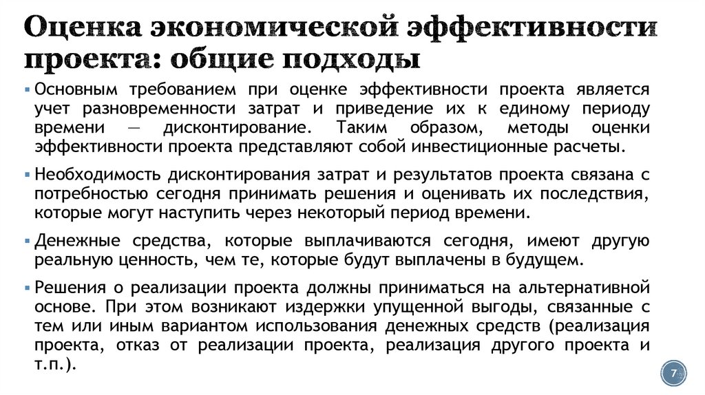 Основным требованием при оценке эффективности проекта являетсяучет разновременности затрат и приведение их к единому периоду