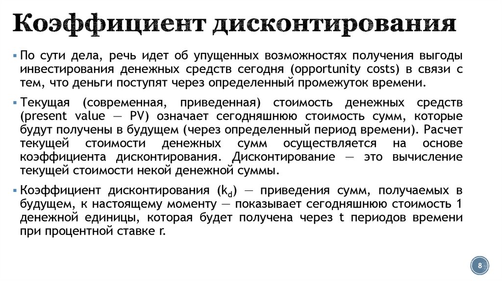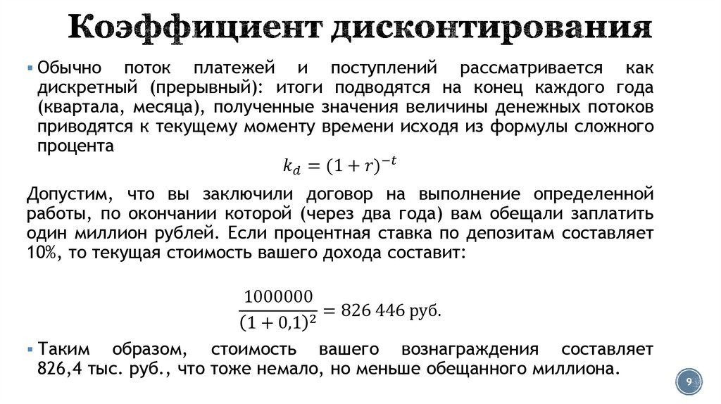 коэффициента дисконтирования. Дисконтирование — это вычисление