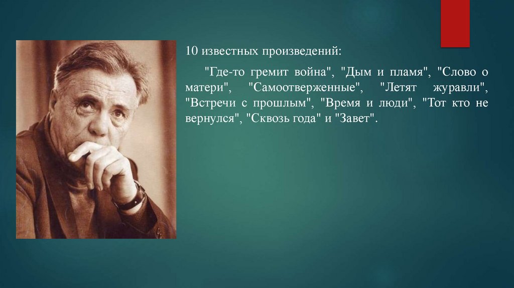 10 известных произведений:"Где-то гремит война", "Дым и пламя", "Слово о