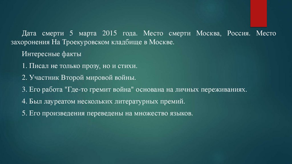 Дата смерти 5 марта 2015 года. Место смерти Москва, Россия. Местозахоронения На Троекуровском кладбище в Москве.
