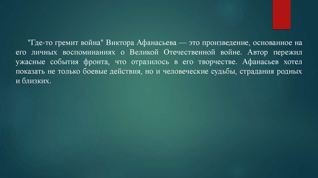 "Где-то гремит война" Виктора Афанасьева — это произведение, основанное наего личных воспоминаниях о Великой Отечественной войне. Автор пережил