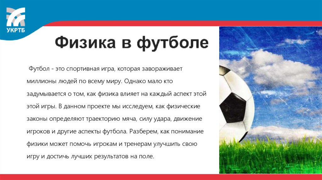 Цель: расширить знания о взаимосвязи физики и футбола, что может привести к улучшениюигрового уровня и результатов как для команд, так и для отдельных игроков.
