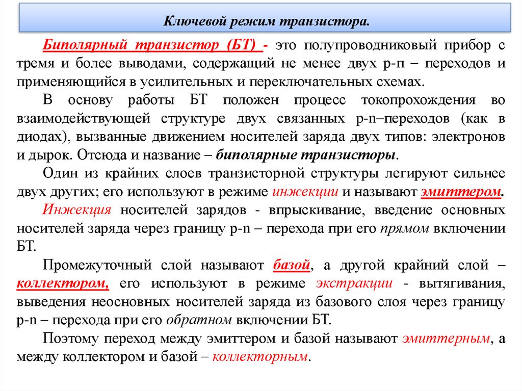 Ключевой режим транзистора.Биполярный транзистор (БТ) - это полупроводниковый прибор с