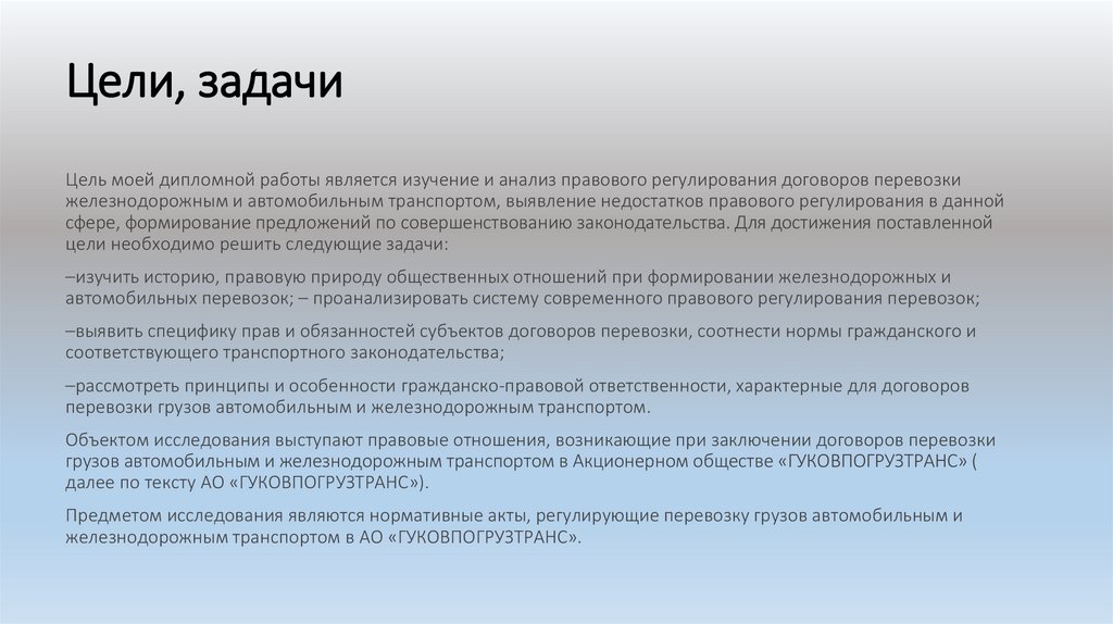 Цели, задачиЦель моей дипломной работы является изучение и анализ правового регулирования договоров перевозки