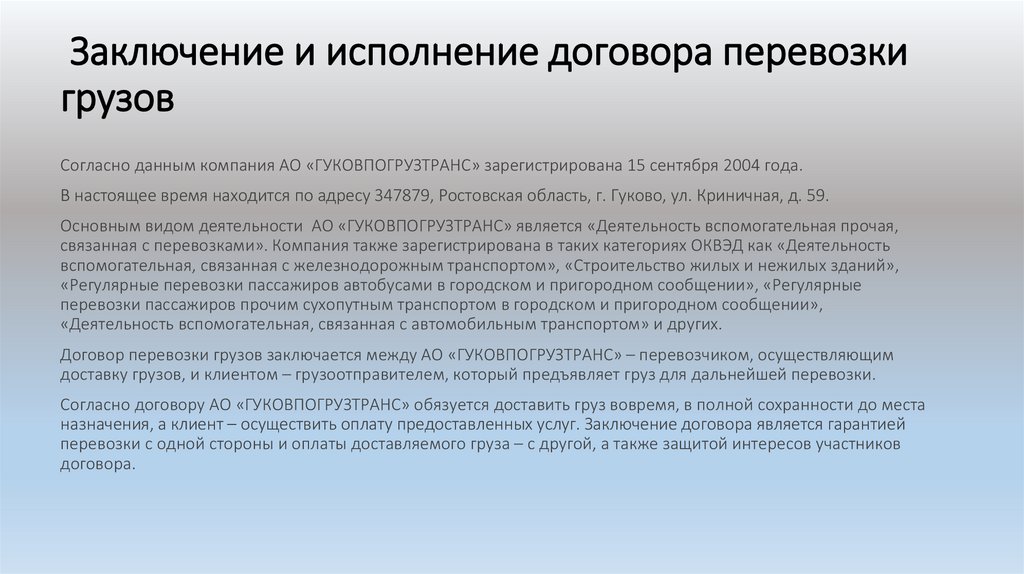 Согласно договору АО «ГУКОВПОГРУЗТРАНС» обязуется доставить груз вовремя, в полной сохранности до места