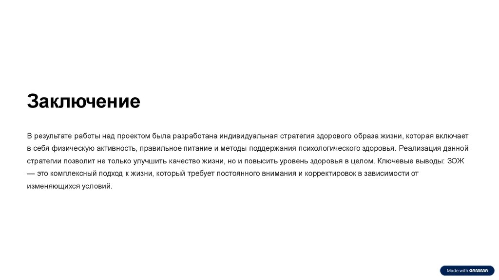 ЗаключениеВ результате работы над проектом была разработана индивидуальная стратегия здорового образа жизни, которая включает