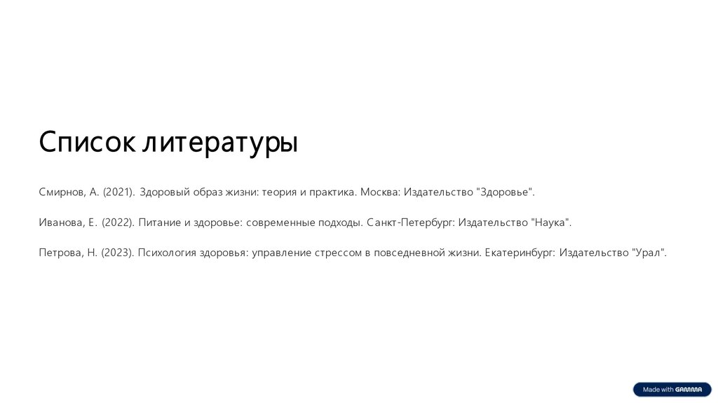 Список литературыСмирнов, А. (2021). Здоровый образ жизни: теория и практика. Москва: Издательство "Здоровье".