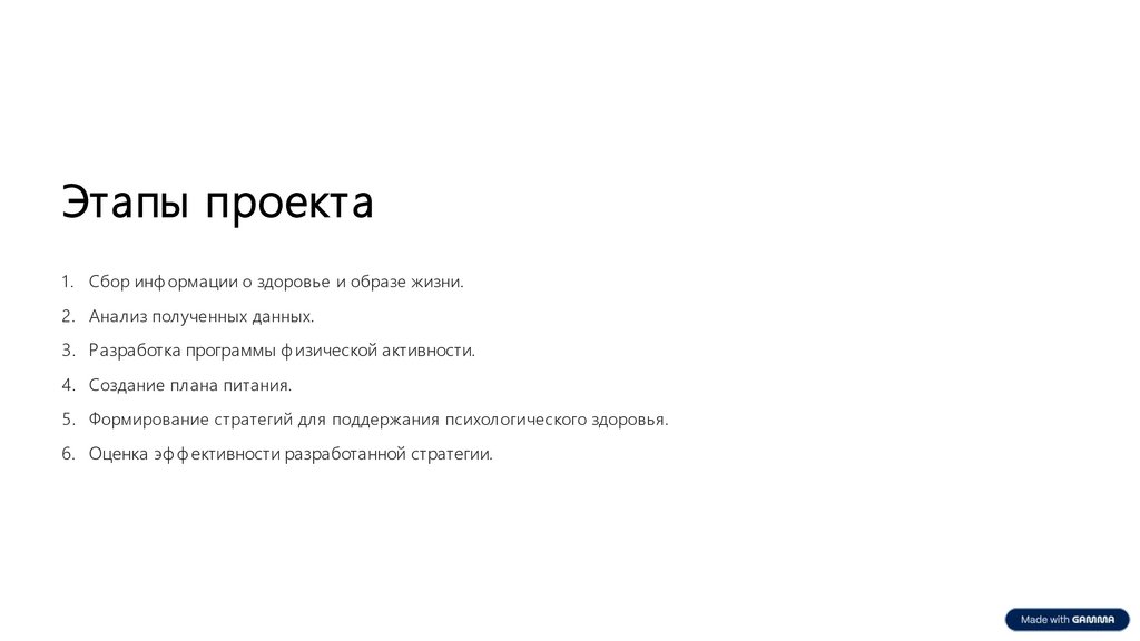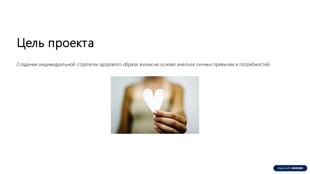 Цель проектаСоздание индивидуальной стратегии здорового образа жизни на основе анализа личных привычек и потребностей.