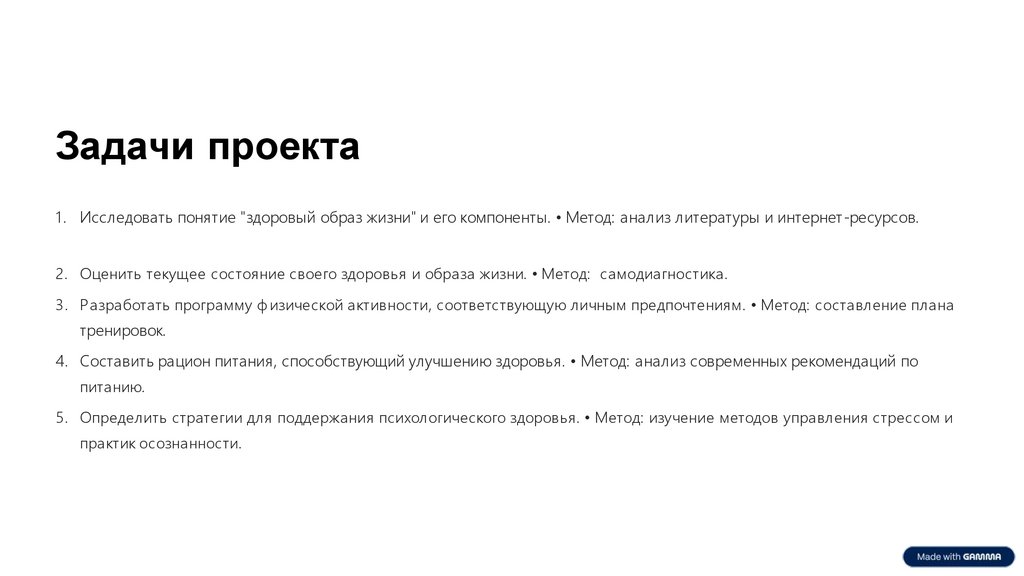 Задачи проекта1 . Исследовать понятие "здоровый образ жизни" и его компоненты. • Метод: анализ литературы и интернет-ресурсов.