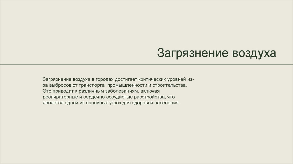 Загрязнение воздухаЗагрязнение воздуха в городах достигает критических уровней изза выбросов от транспорта, промышленности и строительства.