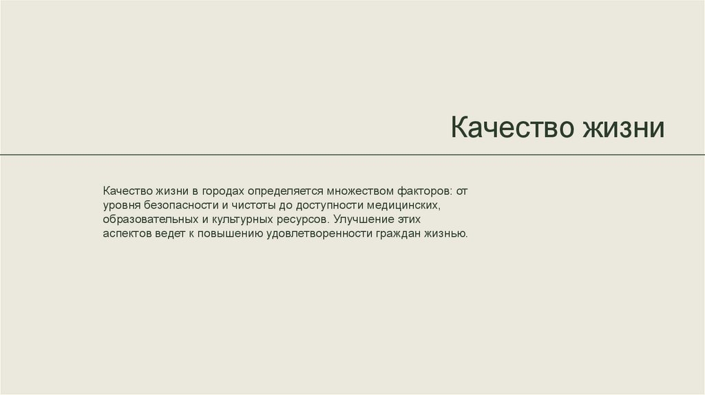 Качество жизниКачество жизни в городах определяется множеством факторов: от