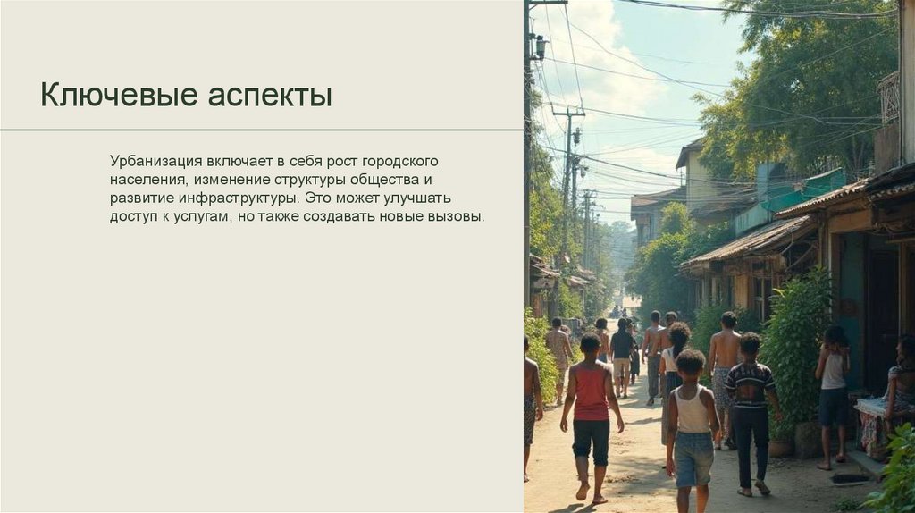 Ключевые аспектыУрбанизация включает в себя рост городского