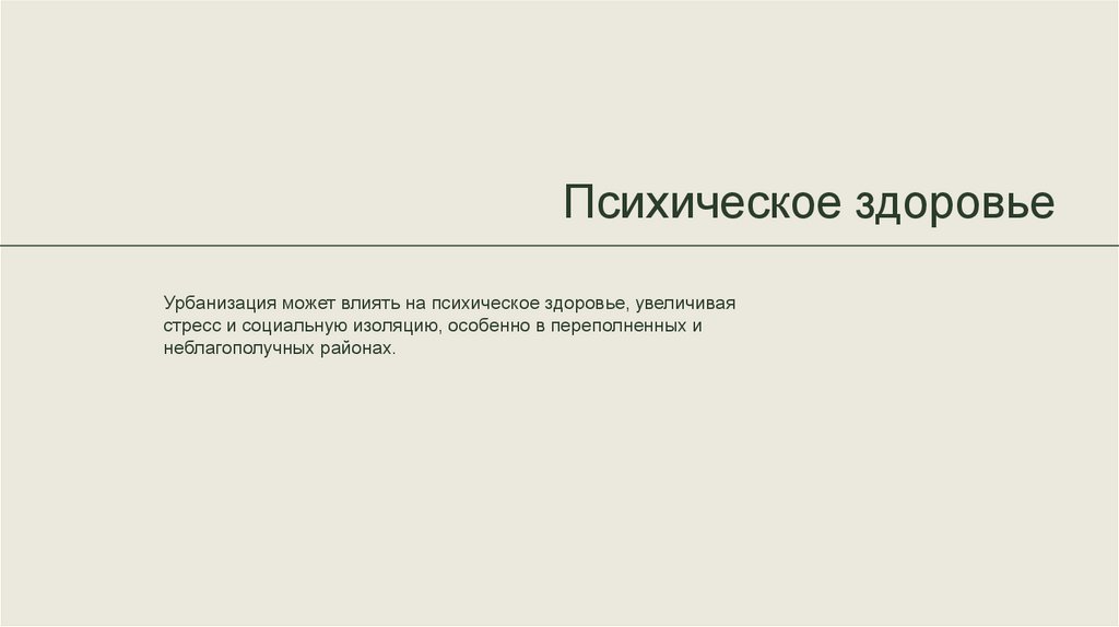 Психическое здоровьеУрбанизация может влиять на психическое здоровье, увеличивая