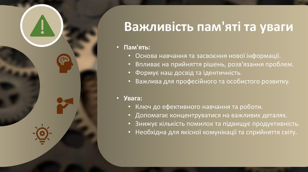 Важливість пам'яті та уваги• Пам'ять: