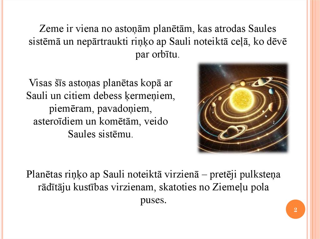 Zeme ir viena no astoņām planētām, kas atrodas Saulessistēmā un nepārtraukti riņķo ap Sauli noteiktā ceļā, ko dēvē