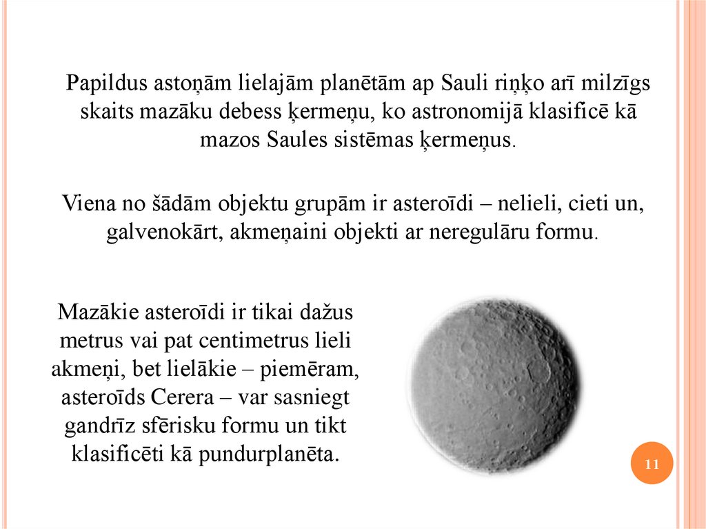 Papildus astoņām lielajām planētām ap Sauli riņķo arī milzīgsskaits mazāku debess ķermeņu, ko astronomijā klasificē kā