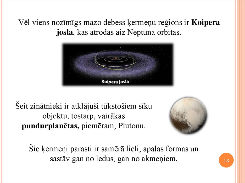 Vēl viens nozīmīgs mazo debess ķermeņu reģions ir Koiperajosla, kas atrodas aiz Neptūna orbītas.