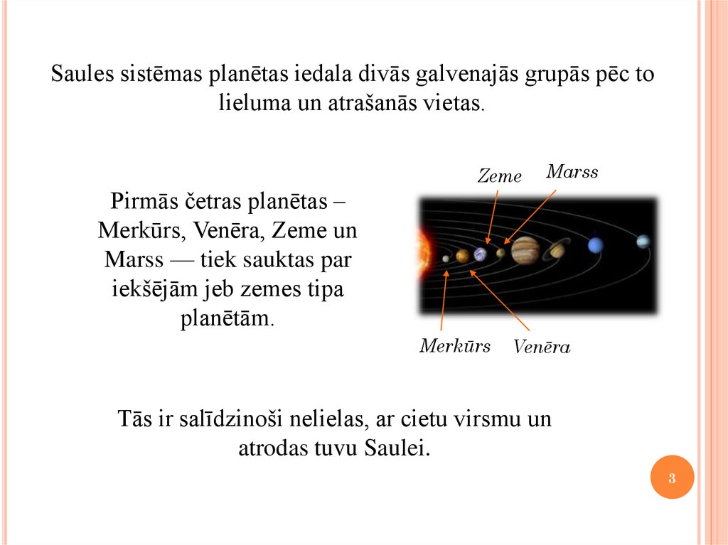 Saules sistēmas planētas iedala divās galvenajās grupās pēc tolieluma un atrašanās vietas.