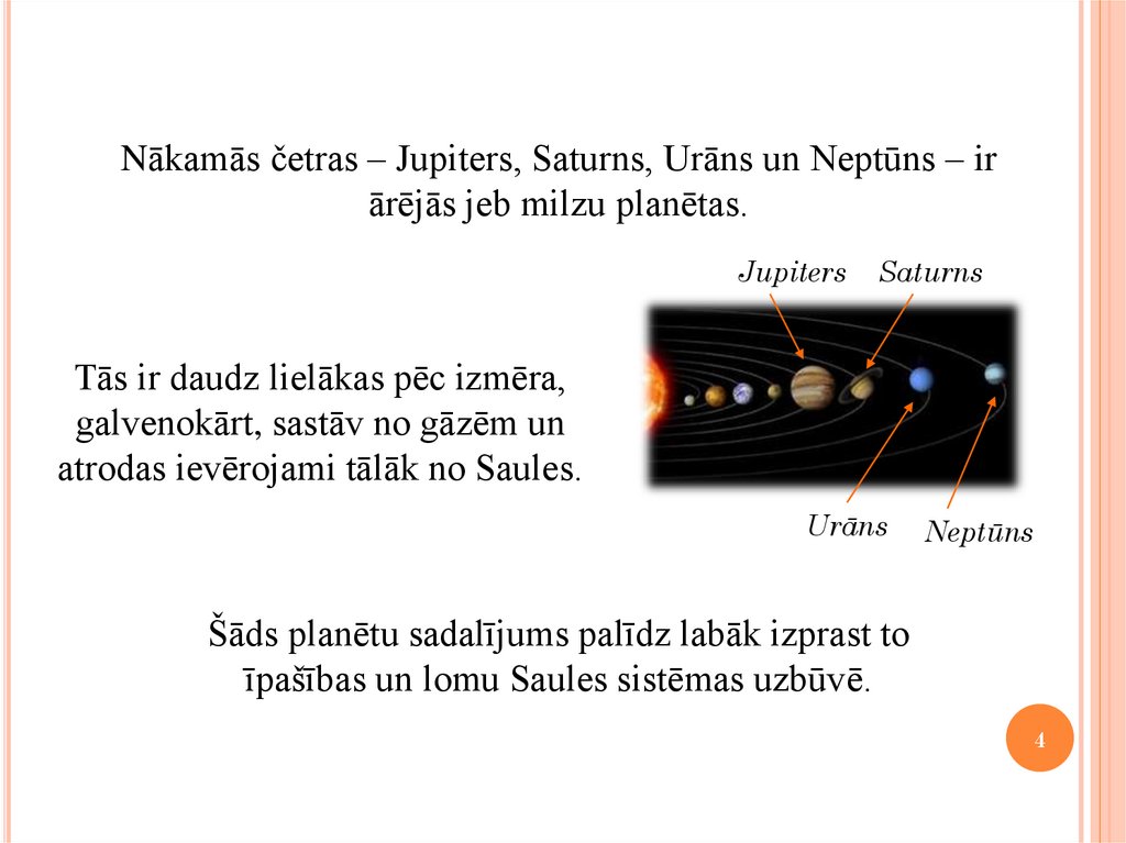 Nākamās četras – Jupiters, Saturns, Urāns un Neptūns – irārējās jeb milzu planētas.
